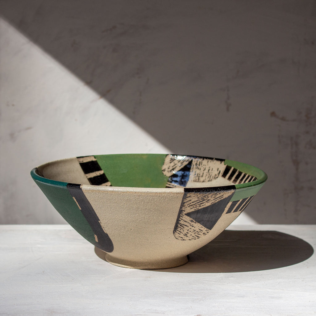 Materials: Matt stoneware exterior with a glazed interior. Slip, underglaze and sgraffito decoration.