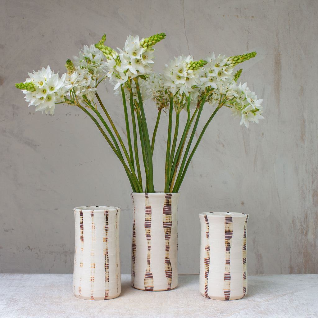 These are all hand thrown on the wheel, hand painted and etched so expect slight variation in size and design.