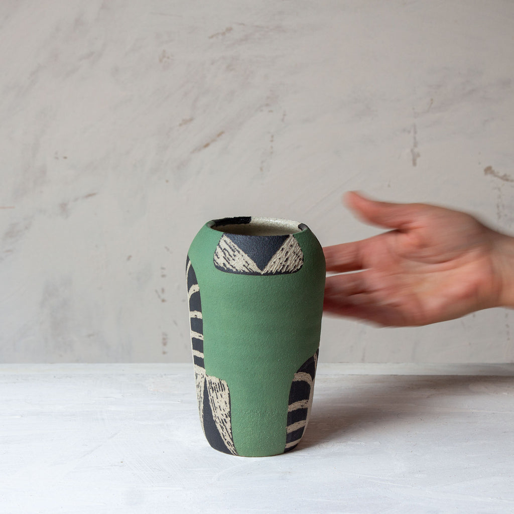 Materials: Matt stoneware exterior with glazed interior. Underglaze, white slip and sgraffito decoration.