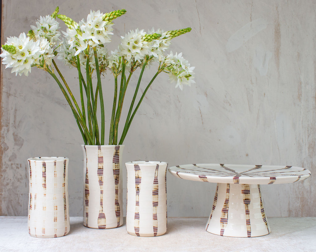These are all hand thrown on the wheel, hand painted and etched so expect slight variation in size and design.