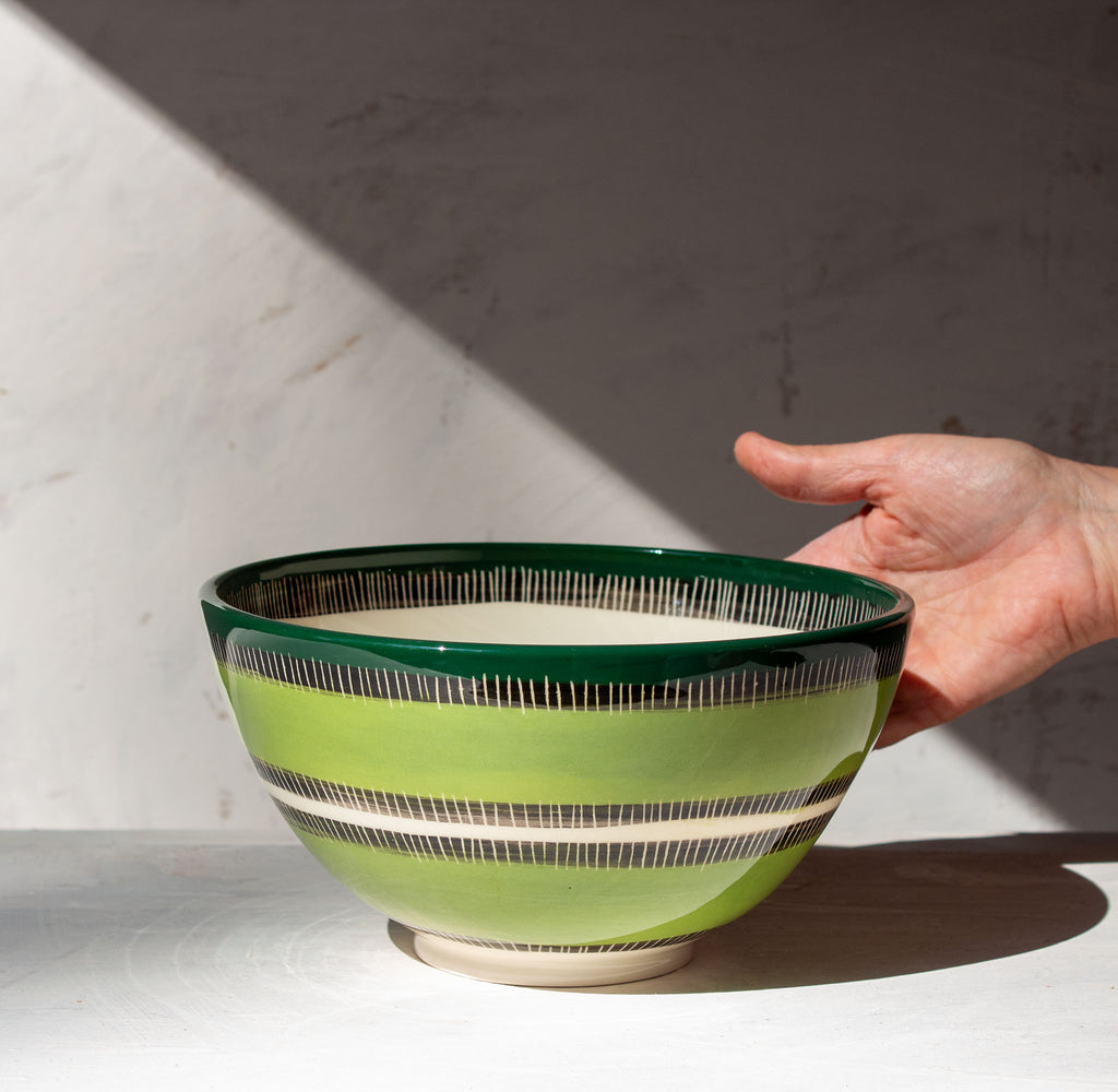 These are all hand-thrown on the wheel, hand-painted and etched, so expect slight variation in size and design.